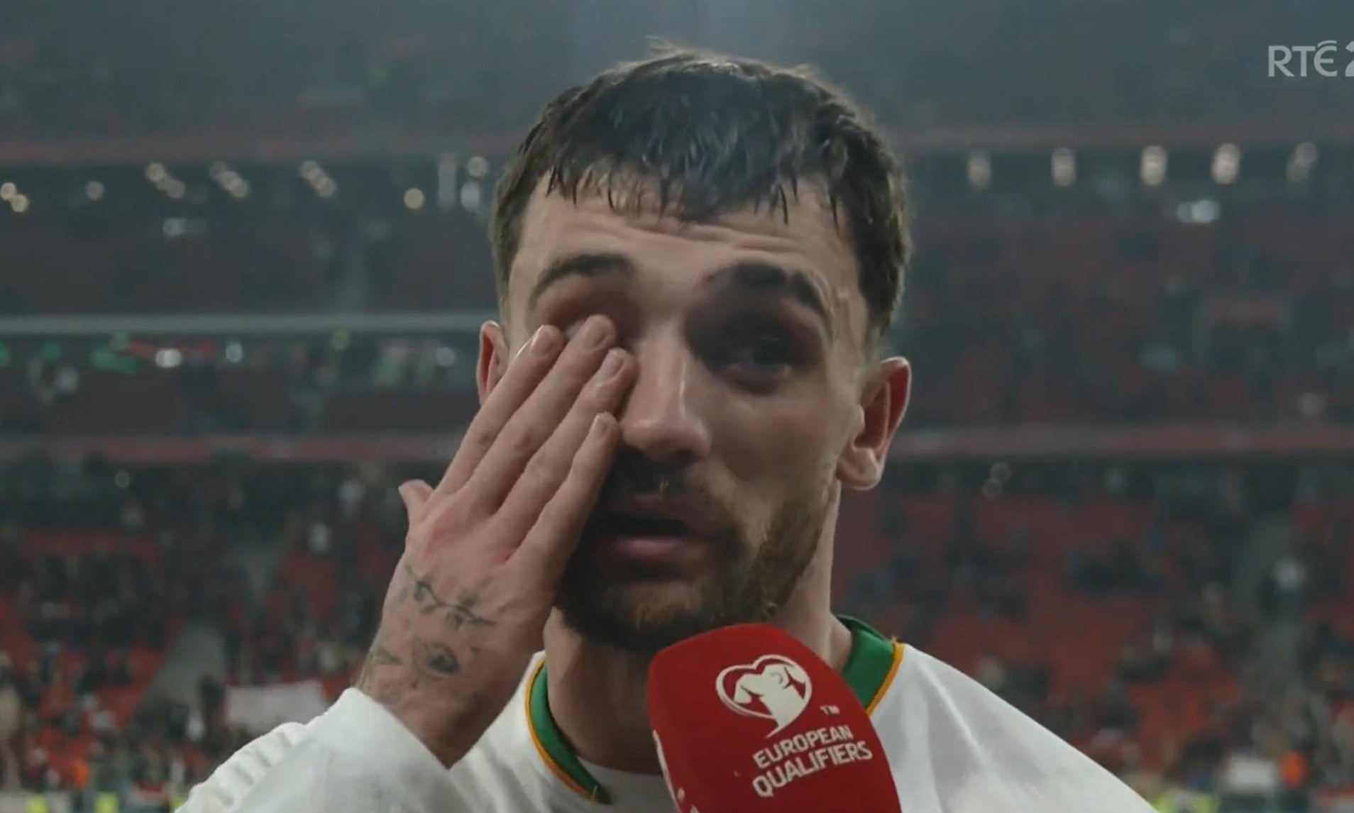 The goal sparked pandemonium in the Irish camp as the squad swarmed their jubilant hero and, speaking post-match, the man of the moment couldn't hold back his tears.