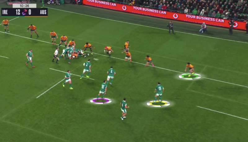 Again, Baird gets his hands up and makes a dart as Gibson-Park passes, and that helps to hold Ikitau [blue] above on Baird, meaning one pass from Ireland takes out four defenders.